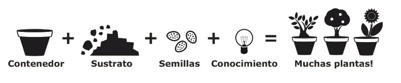 Se basa en 4 premisas que llevan a un resultado: Contenedor + Sustrato + Semilla + Conocimiento = Muchas plantas!